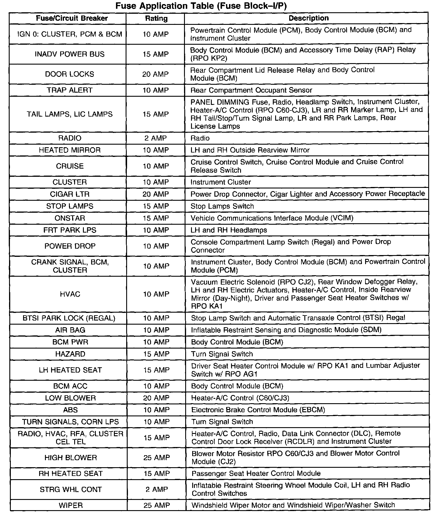 Fuse Application Table (Fuse Block - I/P) Part 1: