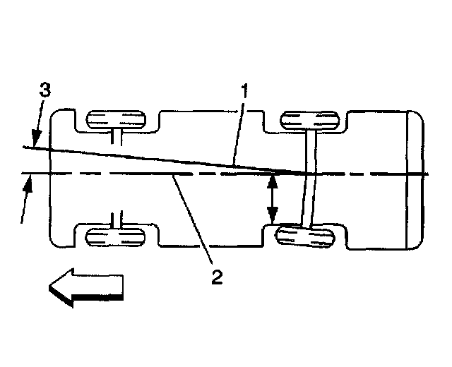 In the illustration, toe-in is shown on the left rear wheel, moving the thrust line (1) off center. The resulting deviation from the centerline is the thrust angle.