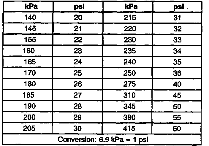 Inflation Pressure Conversion (Kilopascals to PSI)