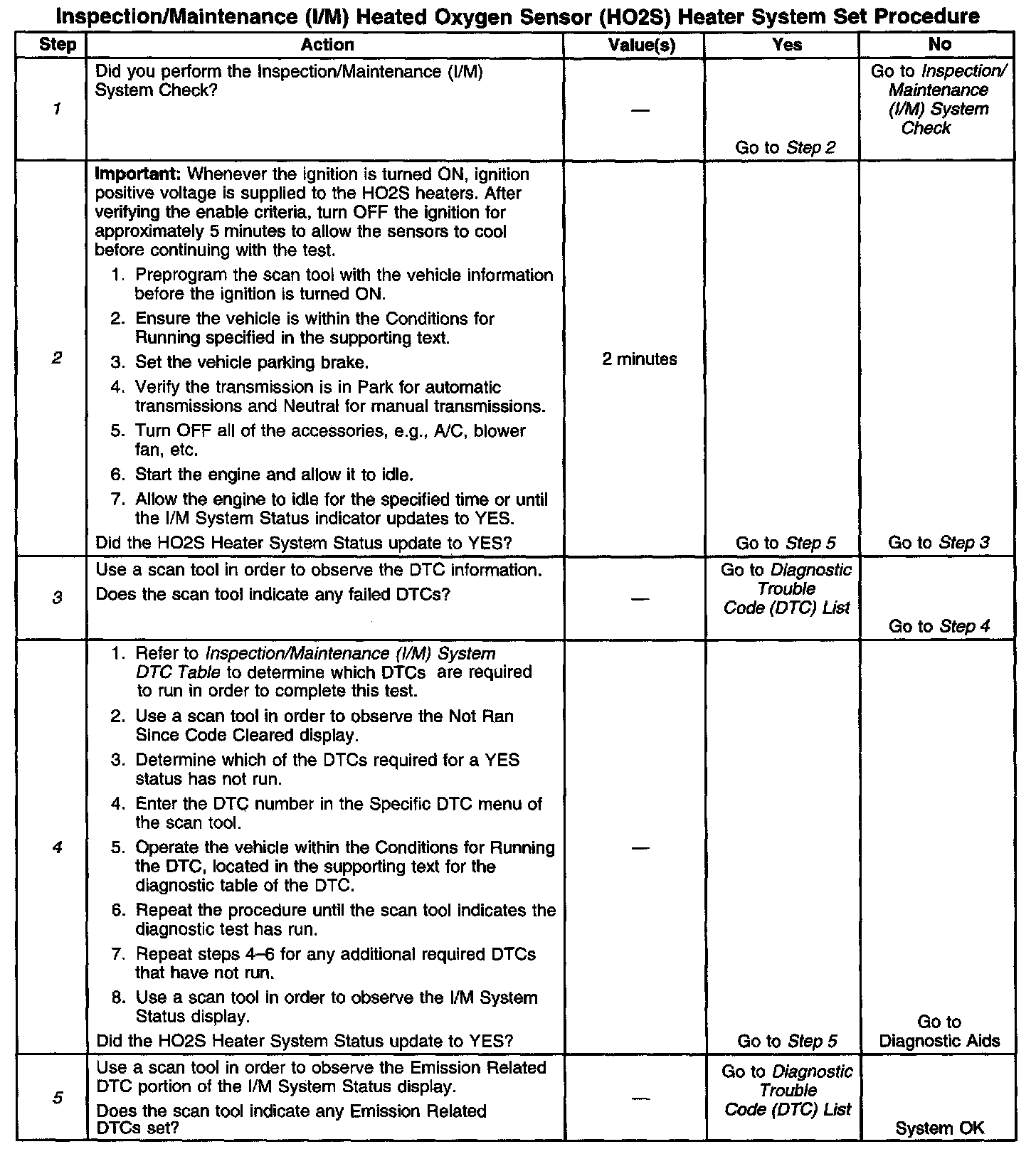 DESCRIPTIONThe purpose of this test is to satisfy the enable criteria necessary to execute I/M readiness diagnostics for the heated oxygen sensor (HO2S) System. The test may be used to set the I/M System Status to YES. Ensure the vehicle meets the requirements listed in Conditions for Running before performing this test. Failure to meet the necessary requirements may produce inaccurate test results.