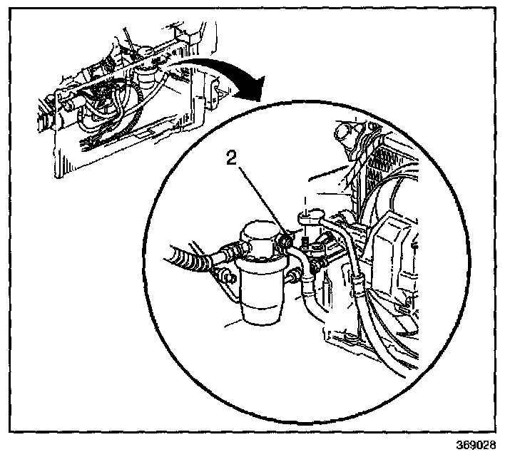 6. Remove the A/C compressor hose nut (2).