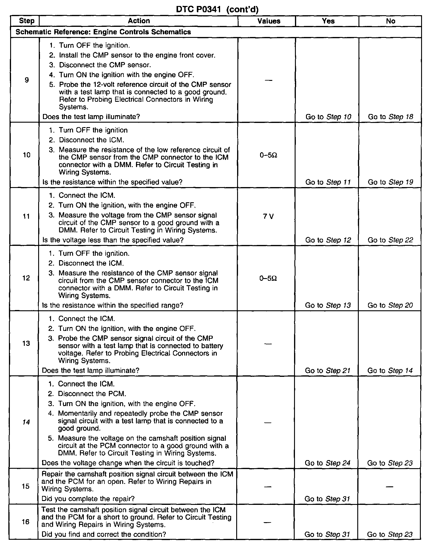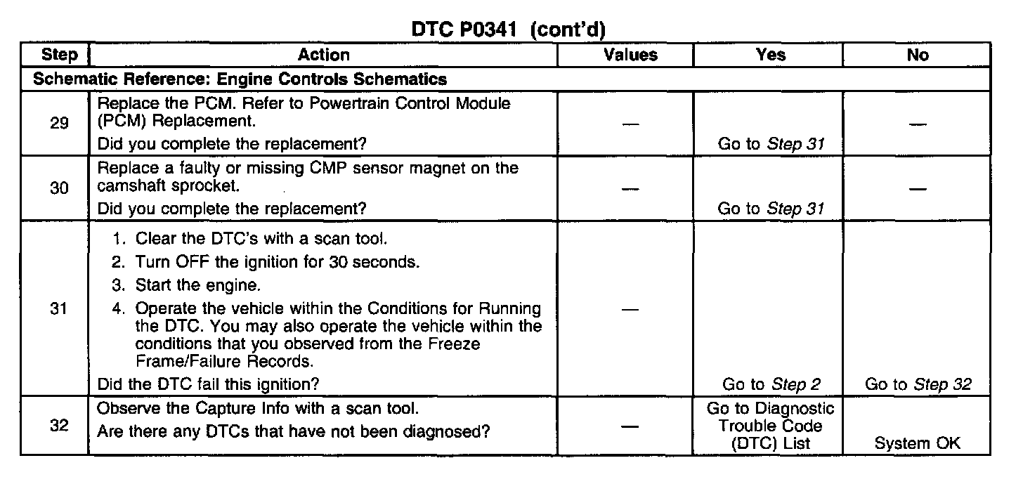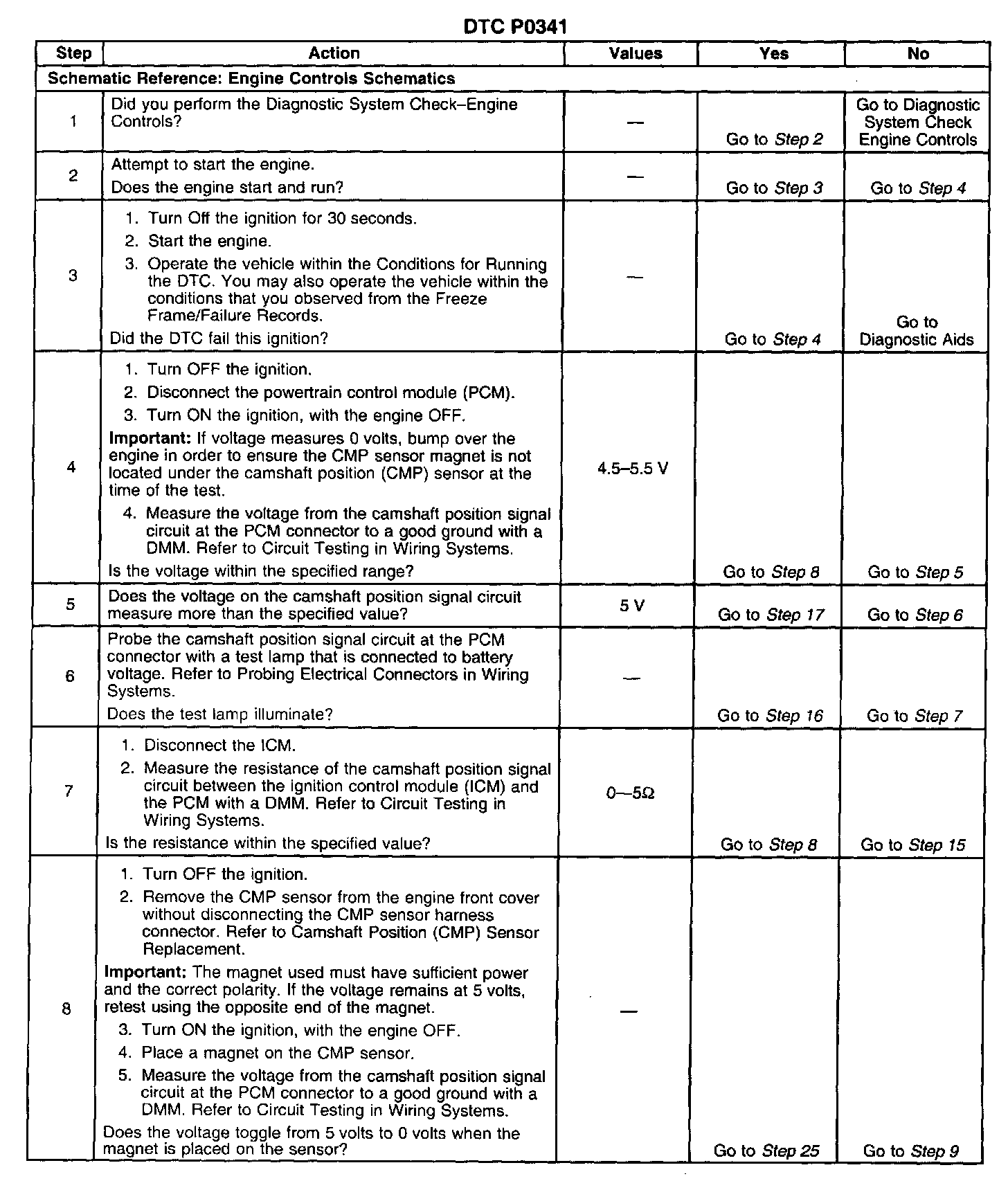 This bulletin is being issued to revise DTC P0341 Camshaft Position (CMP) Sensor Performance in the Engine Controls-3.8L sub-section of the Service Manual. Please replace the current information in the Service Manual with the following information. This revised DTC requires a different diagnostic approach due to a change that affects diagnosis of the camshaft position (CMP) sensor circuit. The change affects the CMP circuit by possibly causing an "engine cranks but does not run" condition if the powertrain control module (PCM) does not recognize the CMP sensor signal. The PCM may or may not set DTC P0341 depending on if the engine was running at the time of the failure.