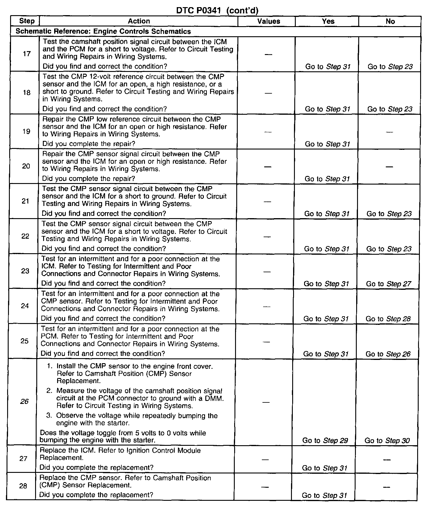 26. This step determines if the fault is caused by a missing camshaft magnet or by a faulty PCM. The voltage measured in this step should be near 5 volts, and decrease to near 0 volts when the CMP sensor interfaces with the camshaft magnet.