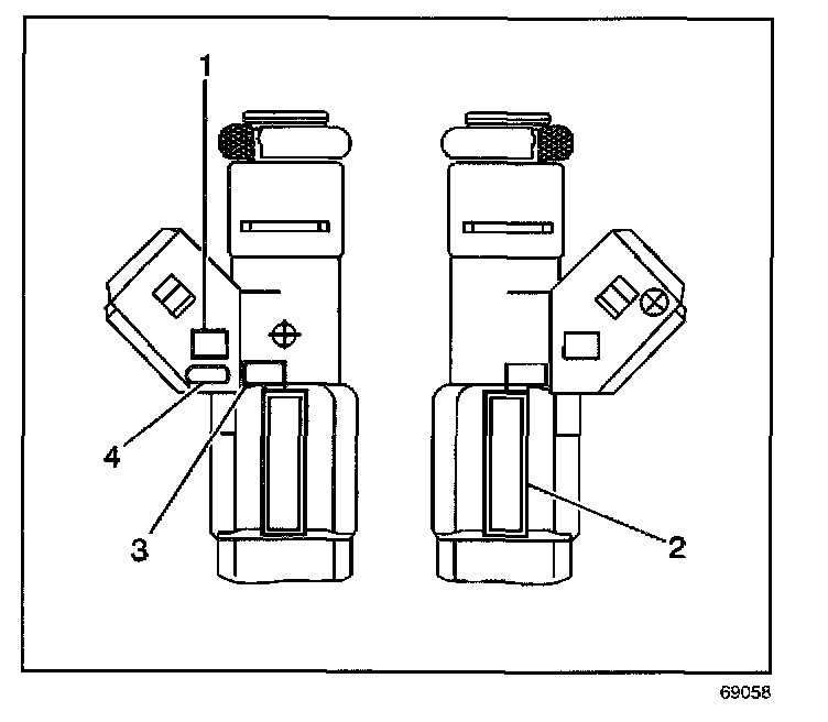 The fuel injector assembly (1) is stamped with a part number identification (2), a manufacturing date (3), a week code (1), and a production plant number (4).