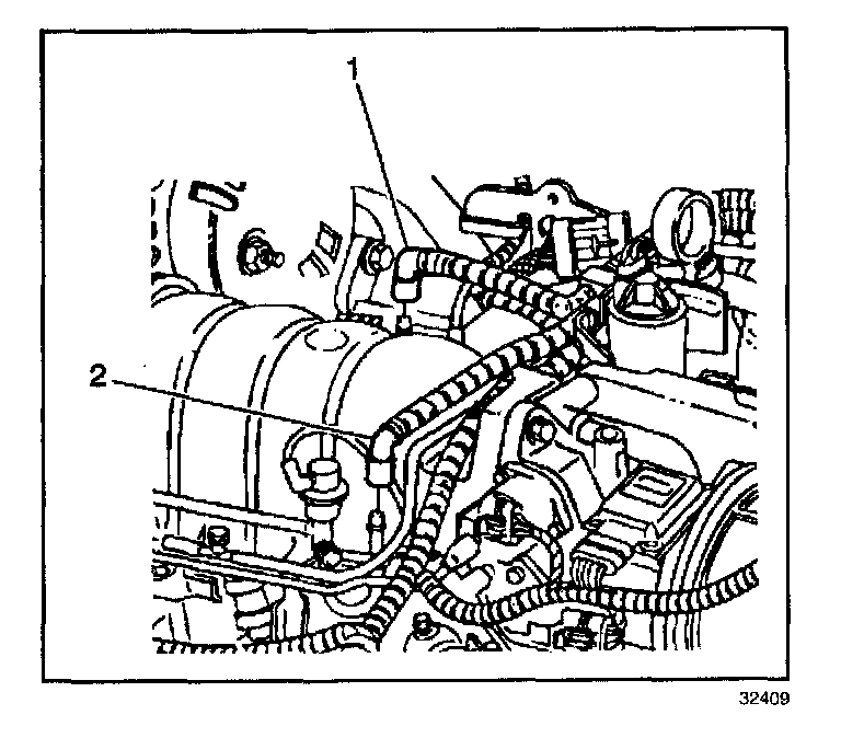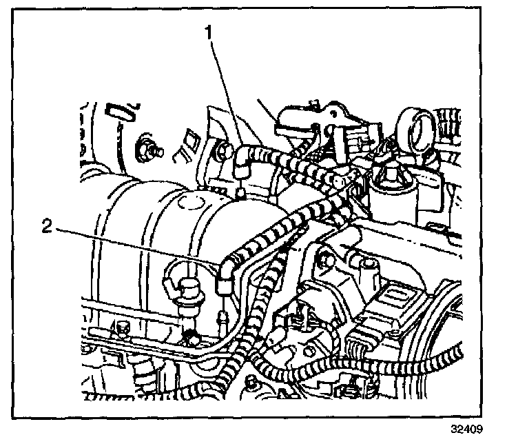 3. Disconnect the fuel feed (1) and return pipes (2) from the fuel rail tubes.