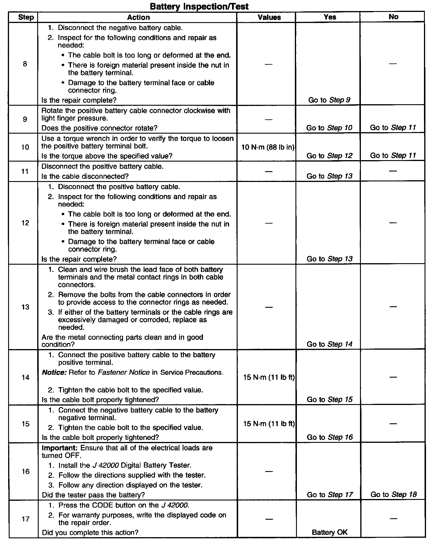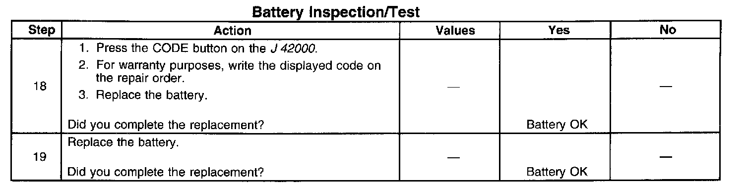^ If the tester displays a REPLACE BATTERY or BAD CELL-REPLACE result for a battery tested in the vehicle with the battery cables connected, perform the following steps: