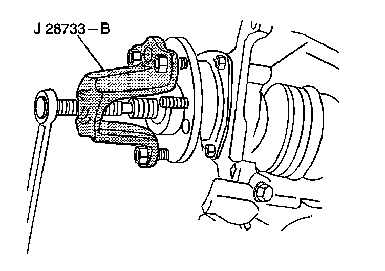 9. Use the J 28733-B in order to push the wheel drive shaft out of the wheel bearing/hub.