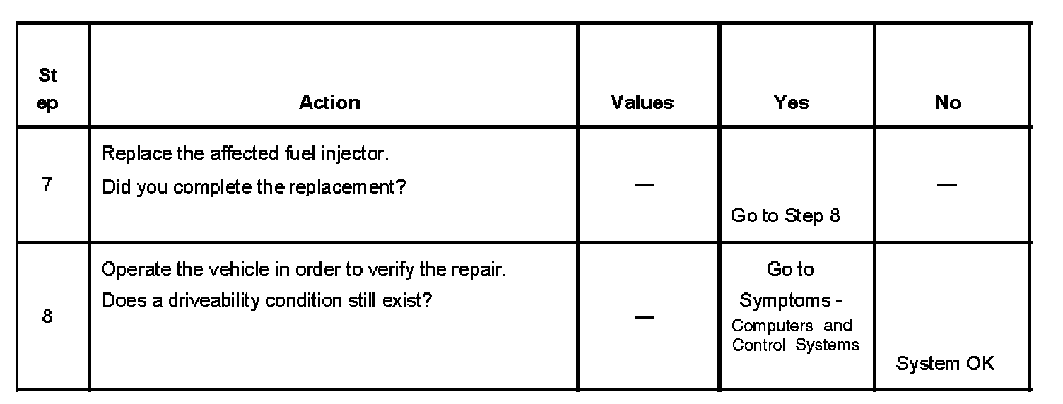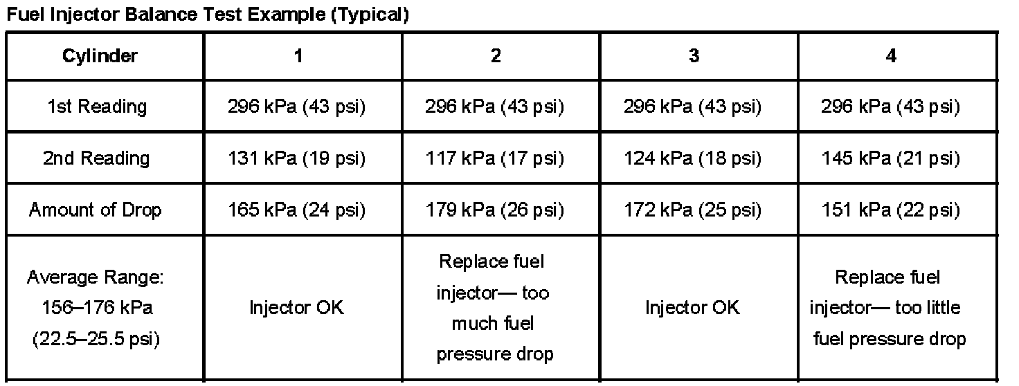 6. If the pressure drop value for each fuel injector is within 10 kPa (1.5 psi) of the average pressure drop value, the fuel injectors are flowing properly. Calculate the pressure drop value for each fuel injector by subtracting the second pressure reading from the first pressure reading. Refer to the illustration.