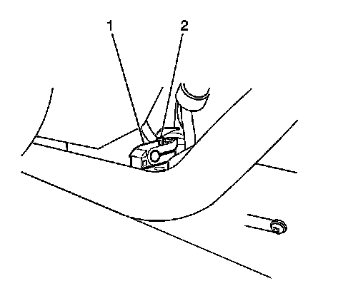 8. Remove the brackets (2) securing the power steering lines at the engine frame by lifting the push pin (1).
