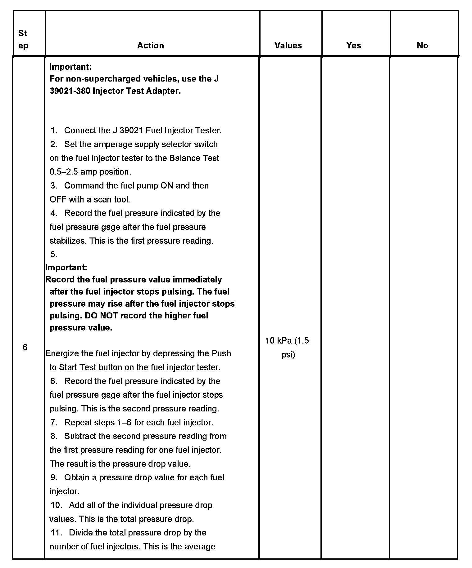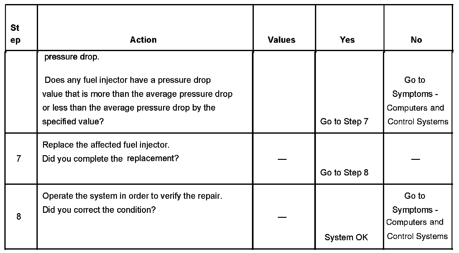 6. If the pressure drop value for each fuel injector is within 10 kPa (1.5 psi) of the average pressure drop value, the fuel injectors are flowing properly. Calculate the pressure drop value for each fuel injector by subtracting the second pressure reading from the first pressure reading. Refer to the illustration.