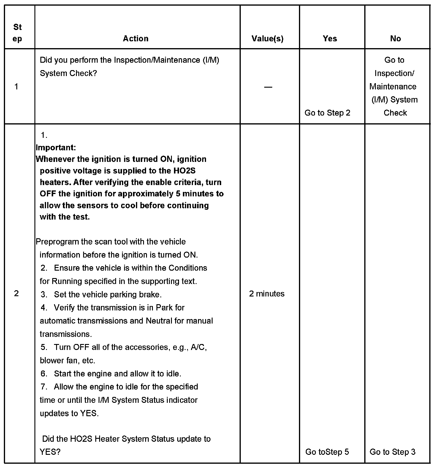 The purpose of this test is to satisfy the enable criteria necessary to execute I/M readiness diagnostics for the heated oxygen sensor (HO2S) System. The test may be used to set the I/M System Status to YES. Ensure the vehicle meets the requirements listed in Conditions for Running before performing this test. Failure to meet the necessary requirements may produce inaccurate test results.