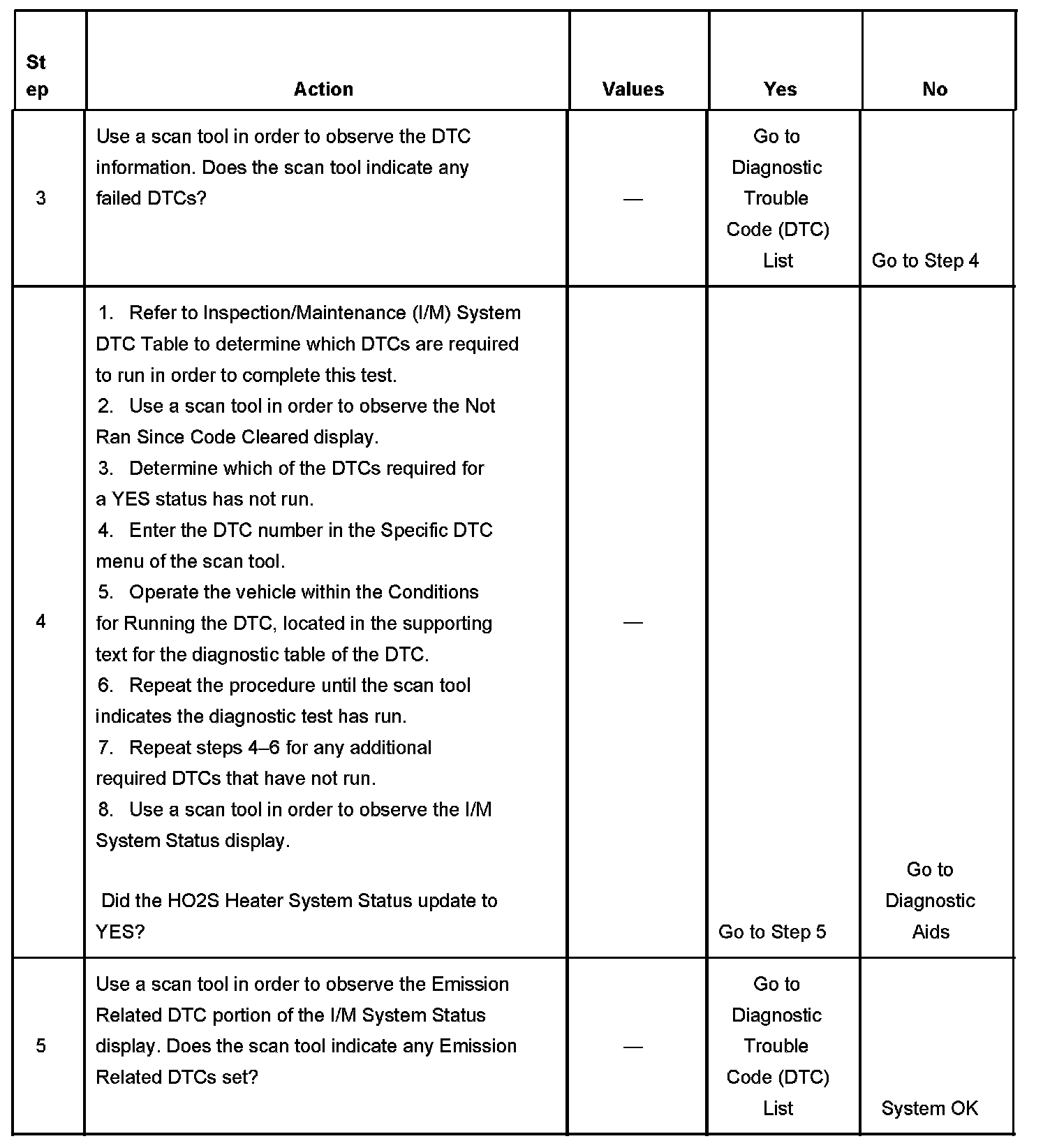 3. This step is to identify a first failure of a type B DTC. A DTC only appears on the I/M System Status display when it becomes a MIL illuminating DTC. This occurs on the second failure of a type B DTC. A first failure of a type B DTC will not allow the I/M System Status to update to YES. Refer to Diagnostic Aids.