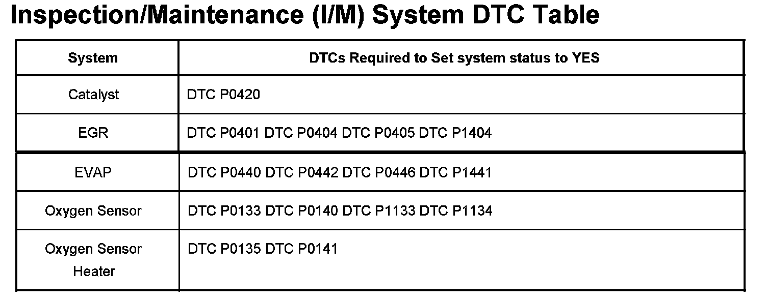 Inspection/Maintenance (I/M) System DTC Table: