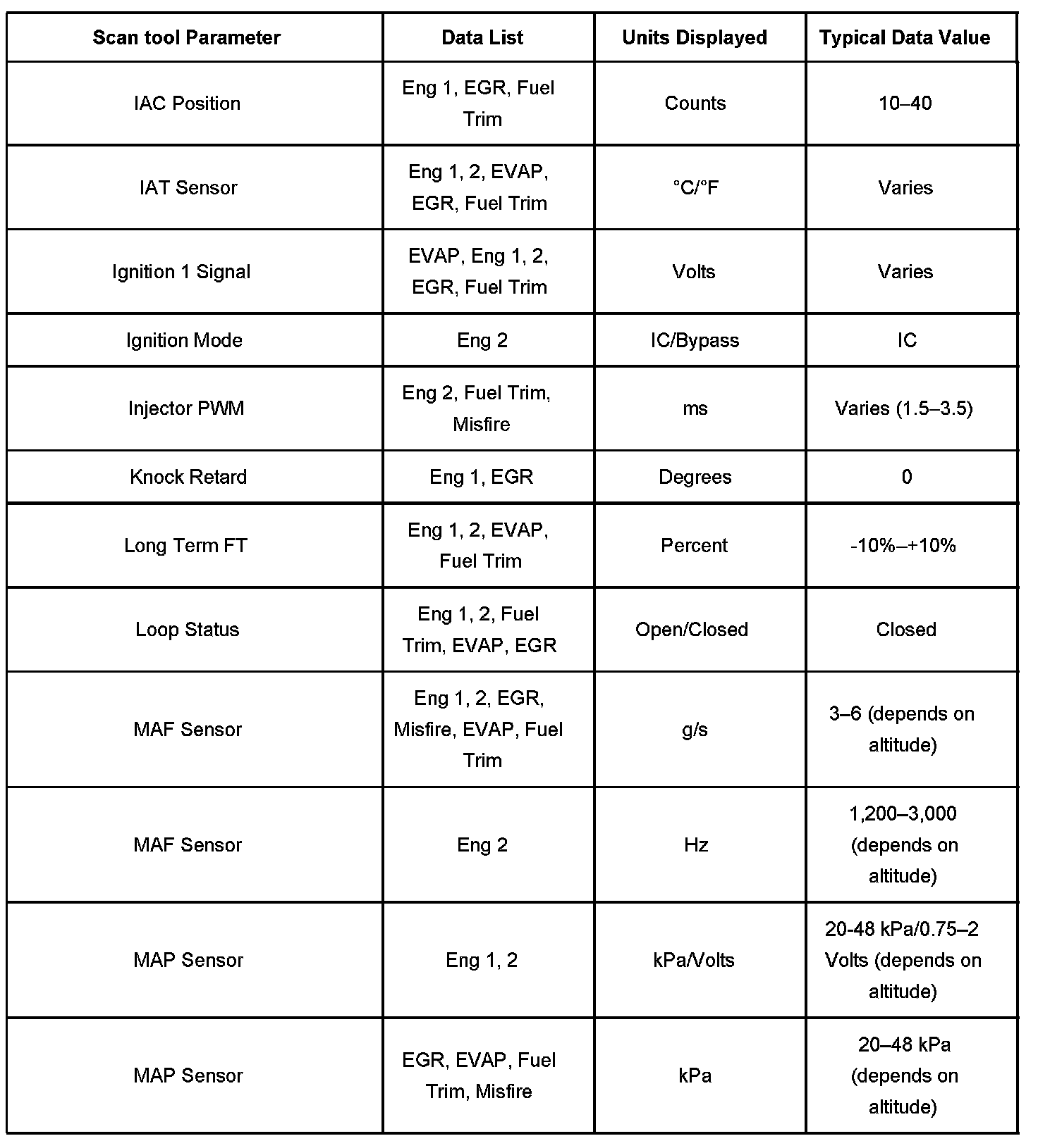 The Engine Scan Tool Data List contains all engine related parameters that are available on the scan tool. The list is arranged in alphabetical order. A given parameter may appear in any one of the data lists, and in some cases may appear more than once, or in more than one data list in order to group certain related parameters together.