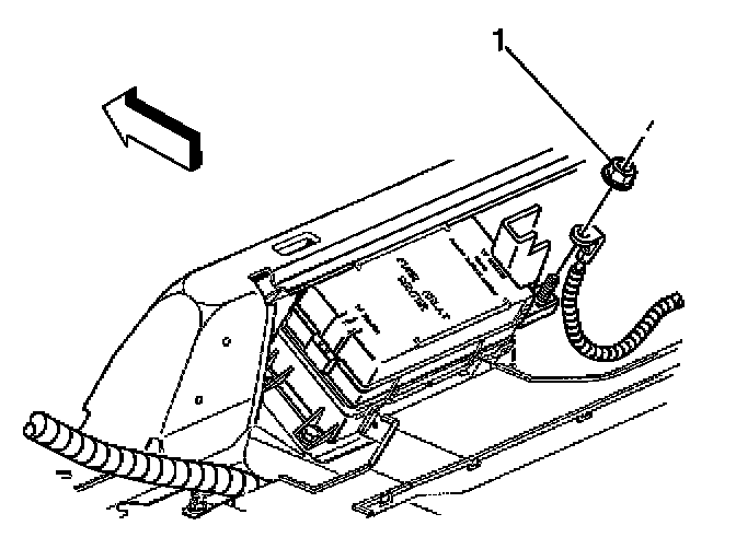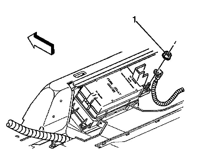4. Remove the positive battery cable nut (1) and cable from the rear electrical center.