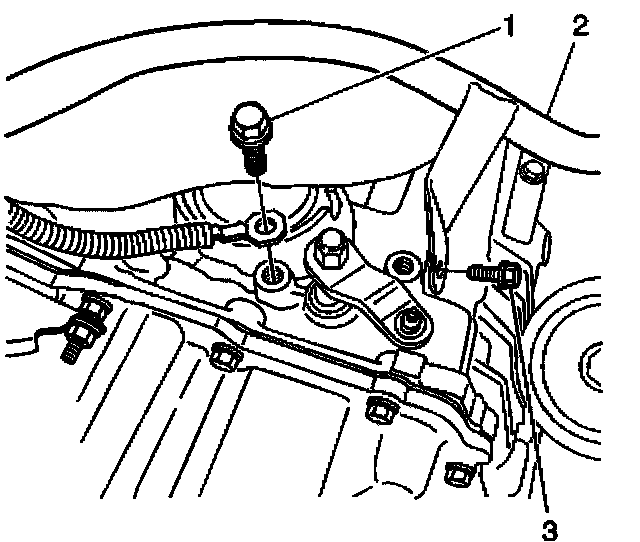 7. Remove the wiring harness (3) from the wiring harness retainer (1) on the transaxle.