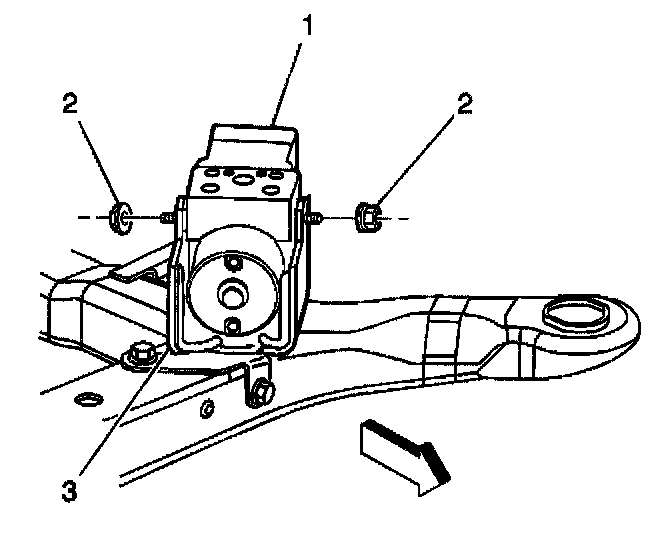 21. Loosen the two mounting nuts (2) in order to allow removal of the brake pressure modulator valve (1) from the bracket (3).
