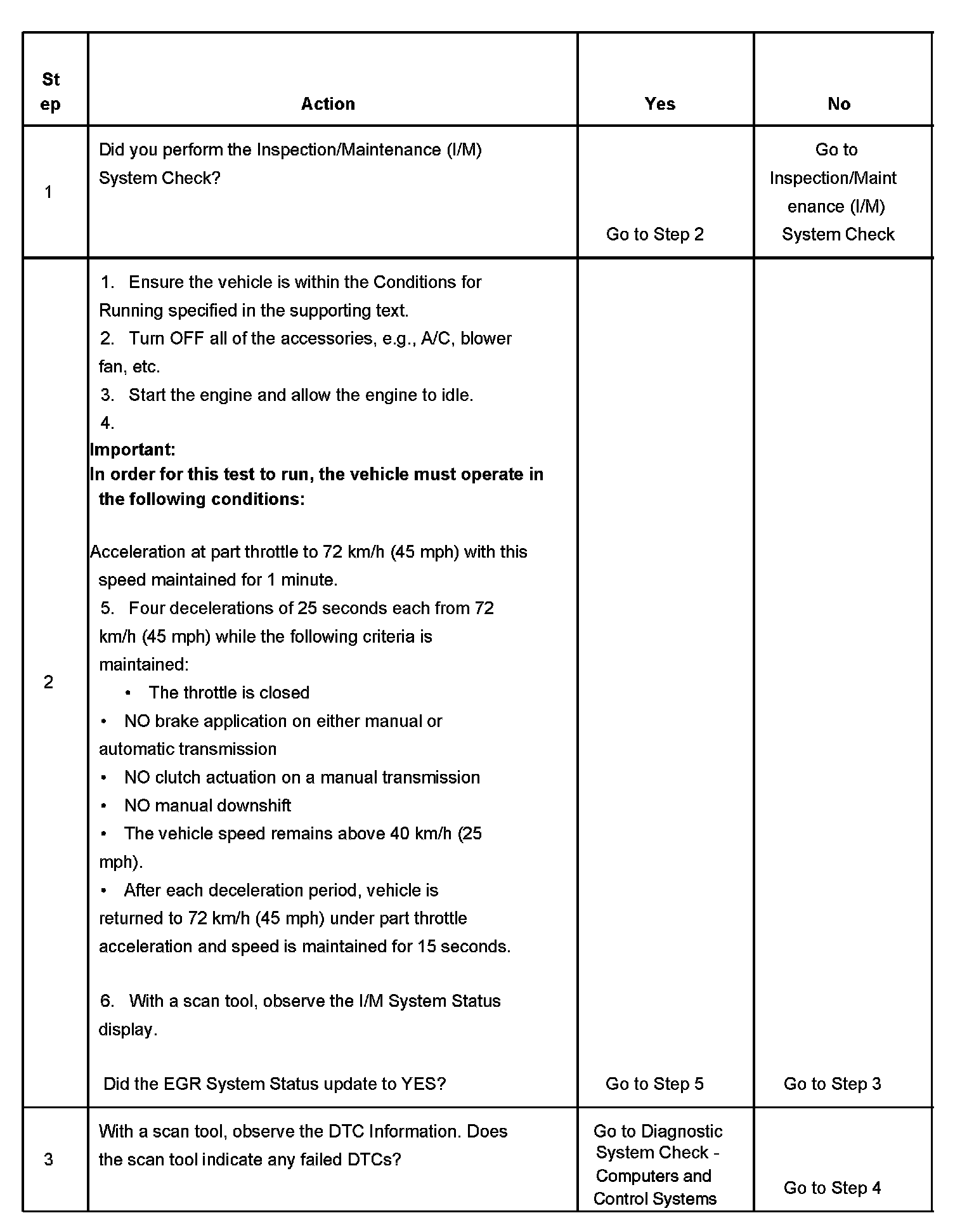 The control module only runs the EGR Active Tests during a gradual deceleration with a closed throttle and a vehicle speed above 40 km/h (25 mph). Several deceleration cycles may be necessary in order to accumulate a sufficient number of EGR flow samples. The procedure outlined in the table is for a clear, flat road. If the procedure is performed on a road with a slight down hill grade, the test may acquire the necessary sample counters in one or two decel trips. If the test is interrupted during the procedure, the test may take more than three deceleration cycles to complete the test. If the status does not update, the test outlined in this procedure can be repeated until the I/M System Status updates to YES.