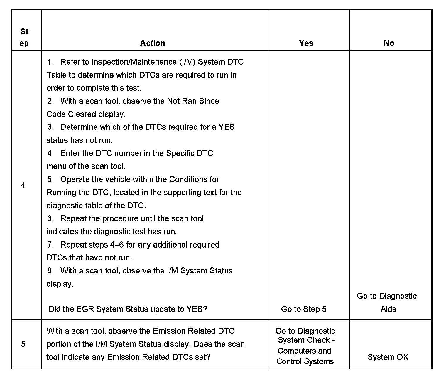 5. The I/M System Status only reports on whether or not a diagnostic has run, not what the outcome of the test was. If any Emission Related DTC sets after the tests are complete, the DTC will require diagnosis.