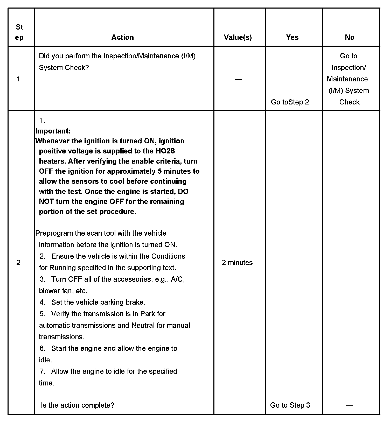 The scan tool can be used to monitor each of the I/M System Status indicators during the I/M Complete System Set Procedure. When all of the indicators for a test step have updated to YES, testing can move on to the next step even if the remaining portion of the test is not complete. For example, step 3 is designed to run the evaporative emission (EVAP), secondary air injection (AIR), and heated oxygen sensor (HO2S) tests. The procedure instructs the technician to operate the vehicle in the enable conditions for 6 minutes. If all 3 tests have updated to YES within 4 minutes, it is not necessary to continue with the enable conditions and testing can advance to the next step.