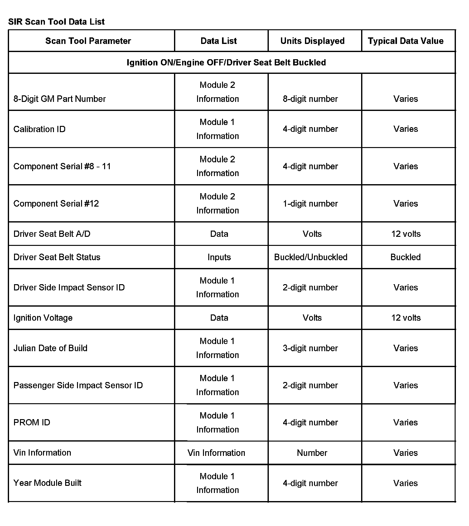 The SIR Scan Tool Data List contains all the restraint system related parameters that are available on the scan tool. The parameters in the list are arranged in alphabetical order. The column, "Data List," indicates the location of the parameter within the scan tool menu selections.