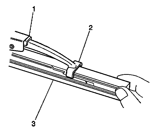 3. Engage the bottom claw (2) of the wiper blade (1) into the notches in wiper blade element (3).