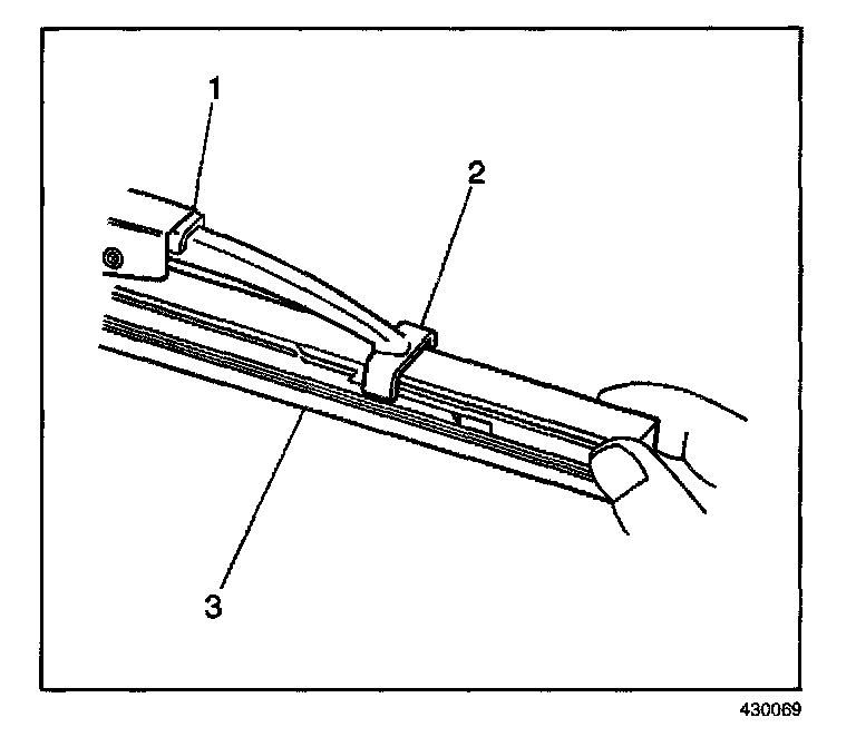 3. Engage the bottom claw (2) of the wiper blade (1) into the notches in wiper blade element (3).