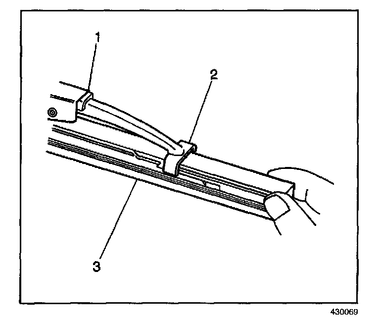 1. Insert the open end of the wiper blade element (3) into the bottom claws of the wiper blade (2).