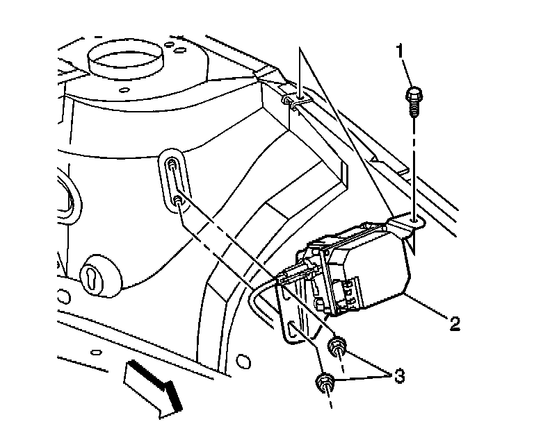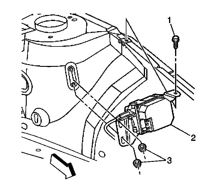 3. Remove the cruise control module bracket retaining fasteners (1, 3).