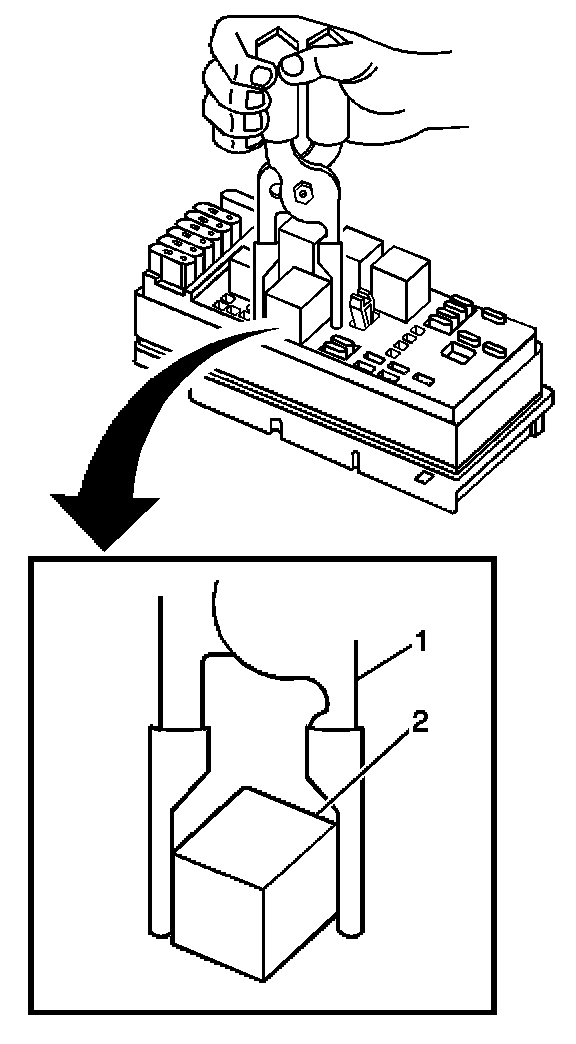 3. Using the J 43244 (1) position the tool on opposing corners of the relay (2).