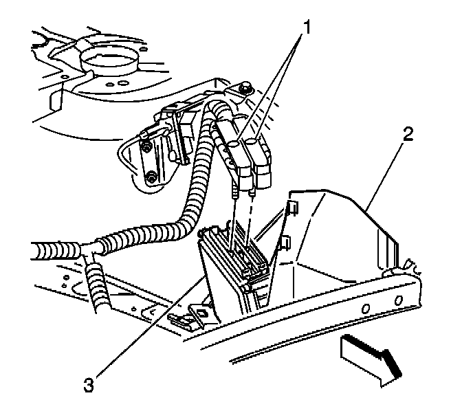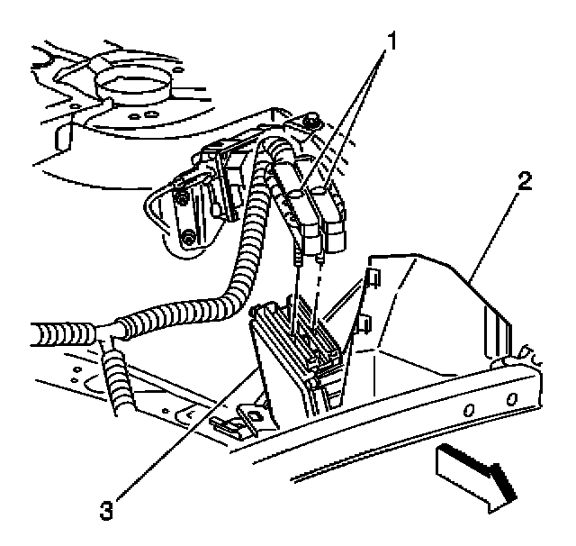 6. Without disconnecting the PCM connectors (1), remove the PCM (3) and harness from the PCM housing (2).