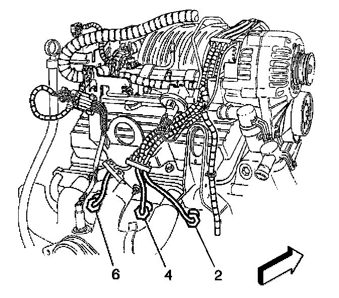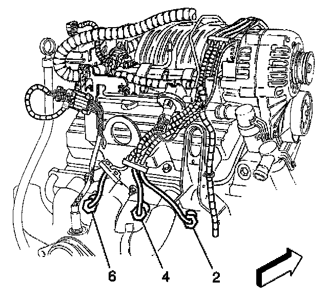 5. Install the spark plug wires (2, 4, 6) to the spark plugs in the proper position at the rear of the engine.