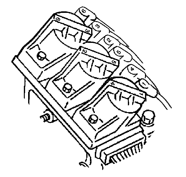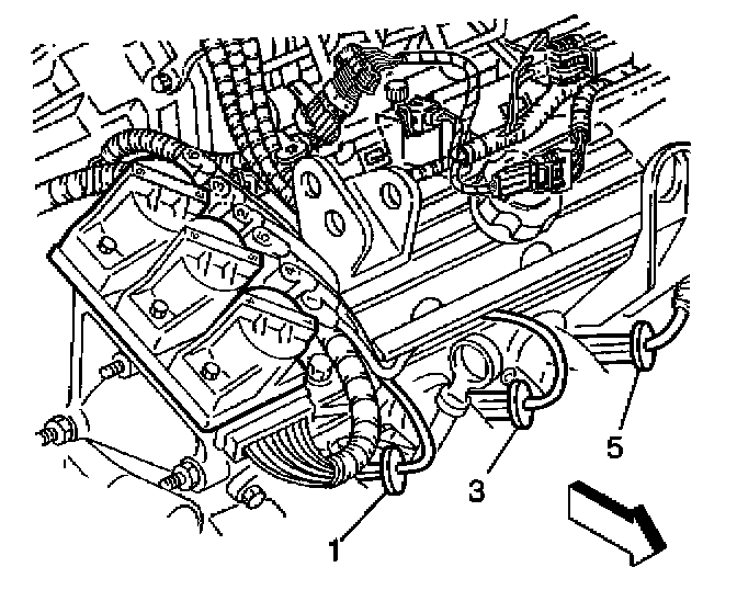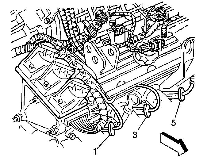 4. Remove the spark plug wires (1, 3, 5) from the spark plugs at the front of the engine using the following steps: