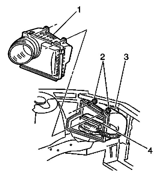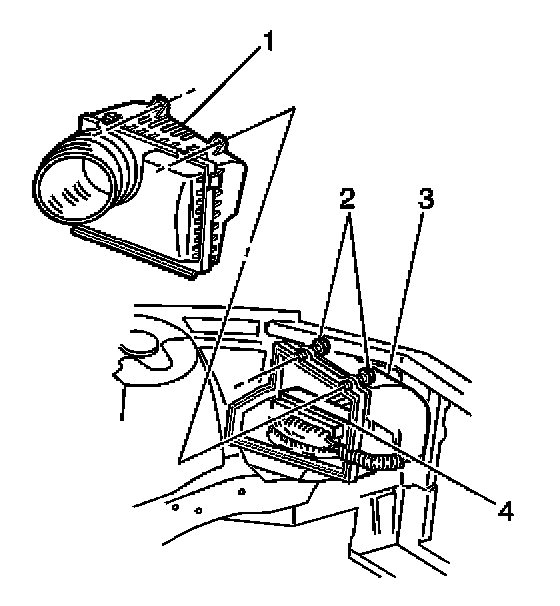 1. Install the lower air cleaner assembly (1) into the 2 rubber grommets (2) in the engine compartment.