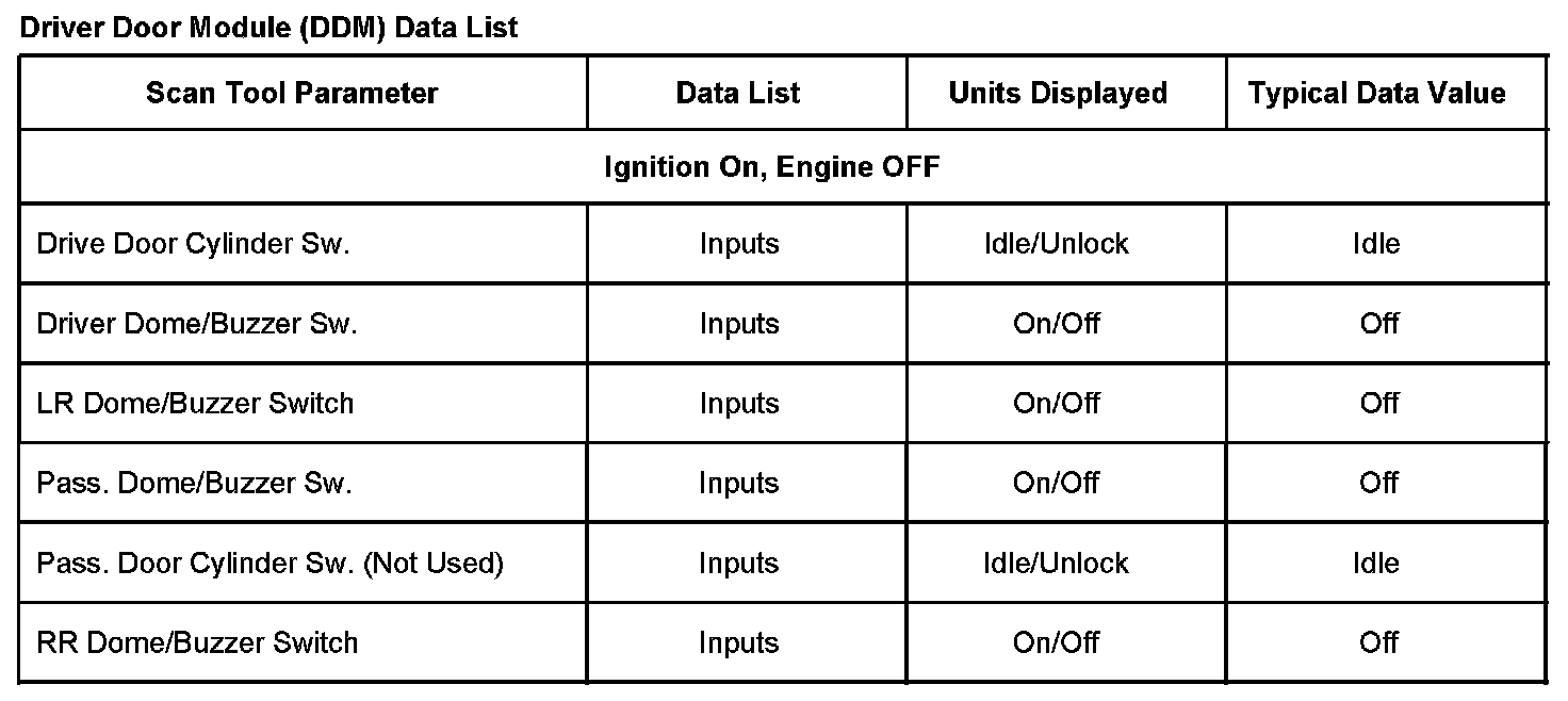 Driver Door Module (DDM) Data List: