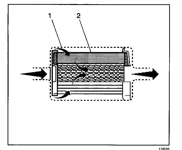 FUEL FILTERThe fuel filter is located on the fuel feed pipe, between the fuel pump and the fuel injectors. The paper filter element (2) traps particles in the fuel that may damage the fuel injection system. The filter housing (1) is made to withstand maximum fuel system pressure, exposure to fuel additives, and changes in temperature. There is no service interval for fuel filter replacement. Replace a restricted fuel filter.