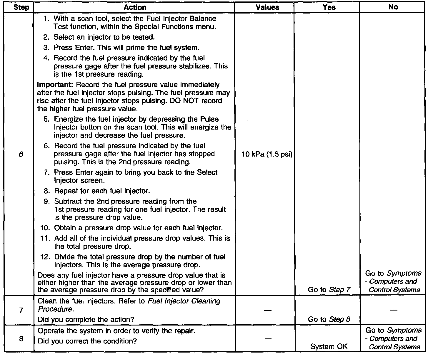 6. If the pressure drop value for each fuel injector is within 10 kPa (1.5 psi) of the average pressure drop value, the fuel injectors are flowing properly.