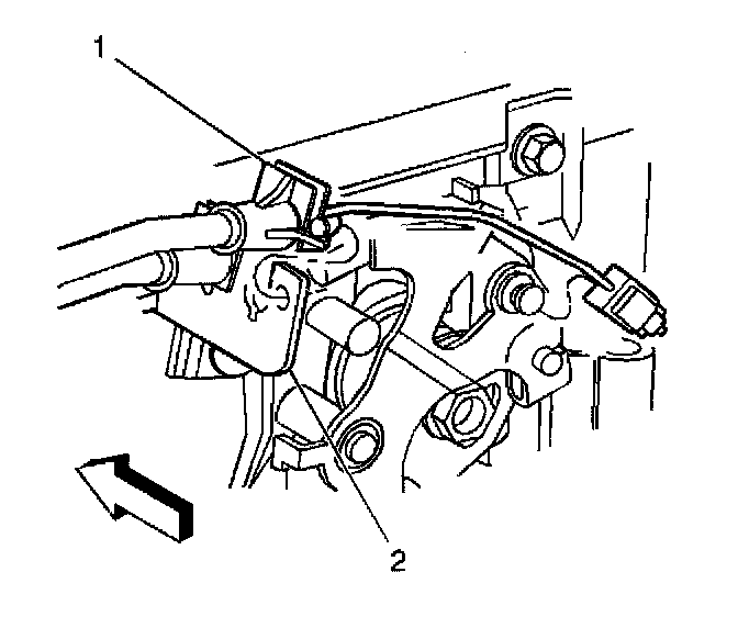 4. Remove both the throttle and the cruise control cables (1) from the throttle body and the accelerator control bracket (2).