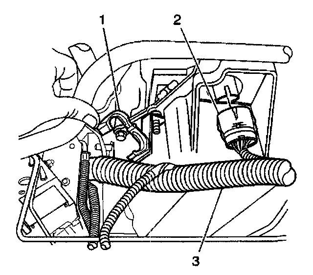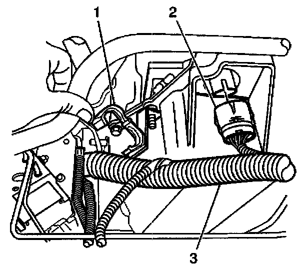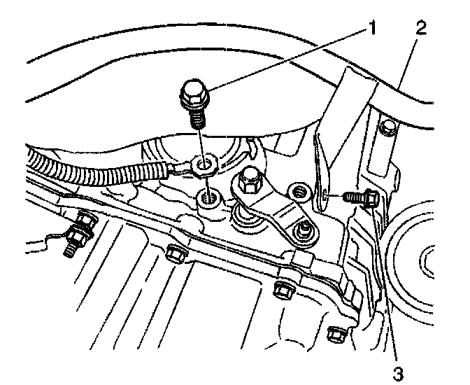 8. Disconnect the wiring harness (3) from the wiring harness retainer (1) on the transaxle.