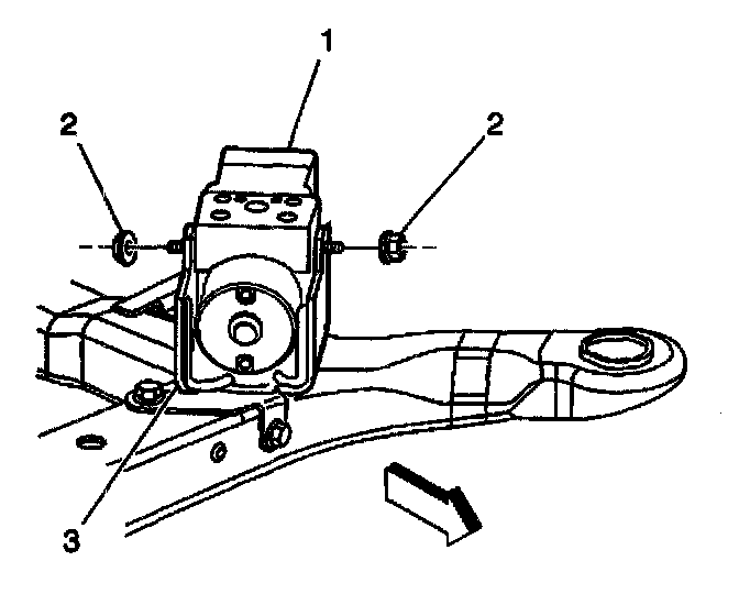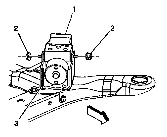 28. Loosen the two mounting nuts (2) in order to allow removal of the brake pressure modulator valve (1) from the bracket (3).