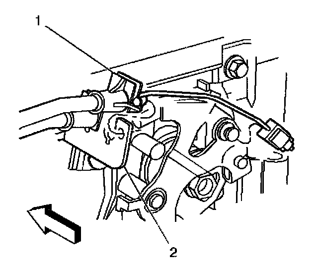 43. Install the throttle and cruise control cables (1) into the throttle body and the accelerator control bracket (2).