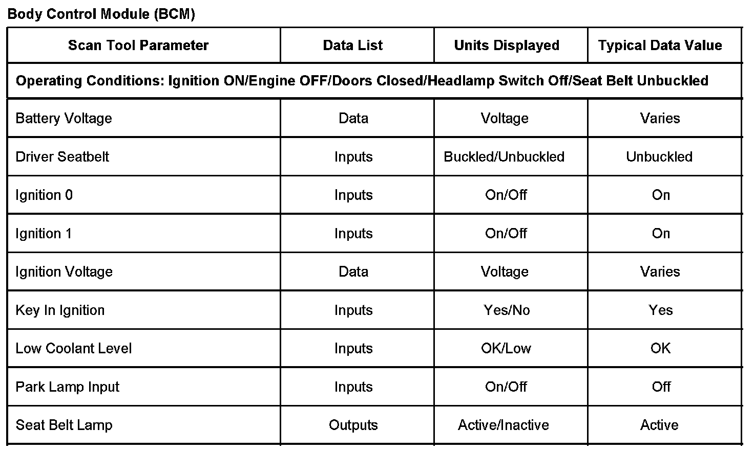 Scan Tool Data List - Body Control Module (BCM)