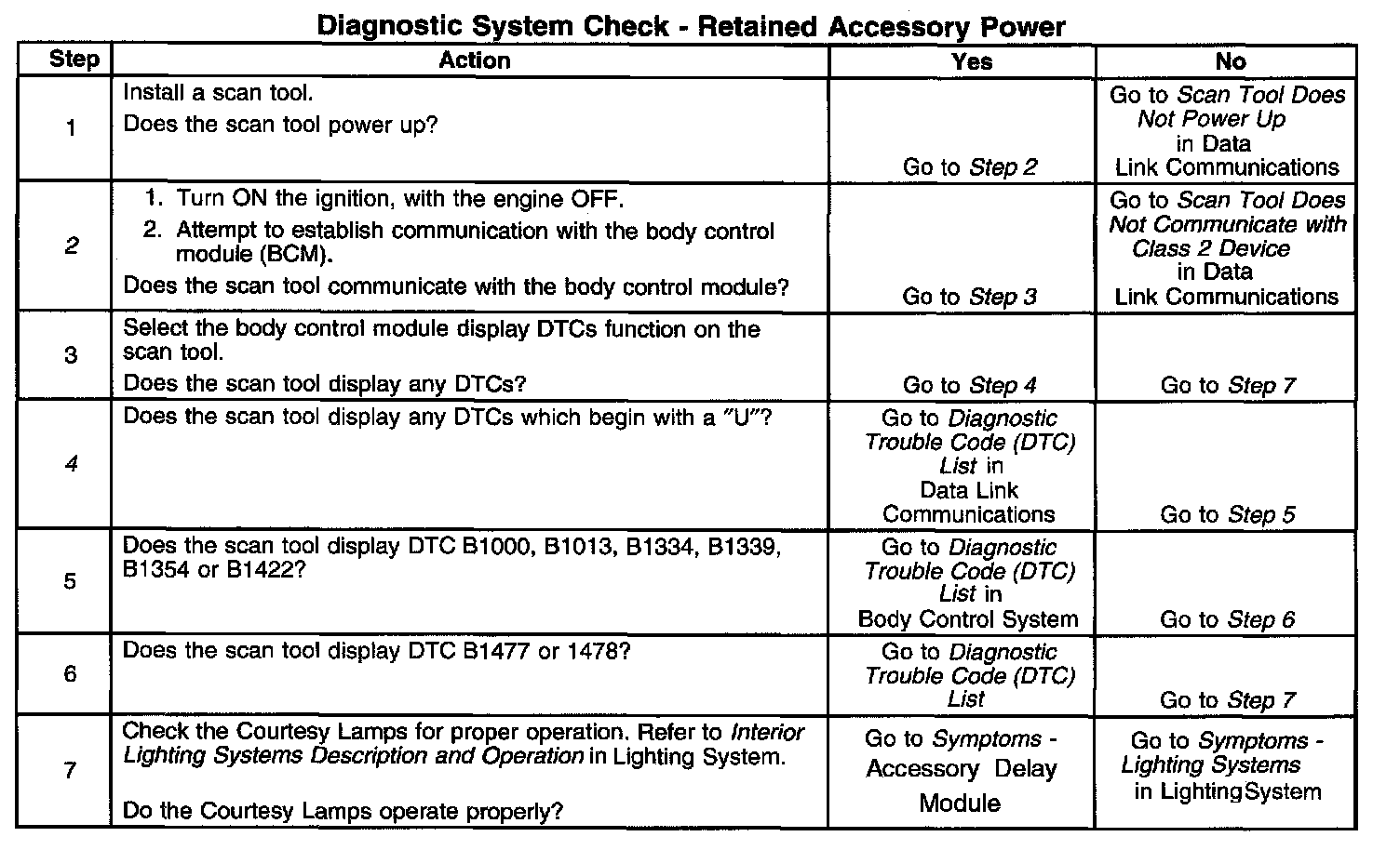 The numbers below refer to the step numbers on the diagnostic table.