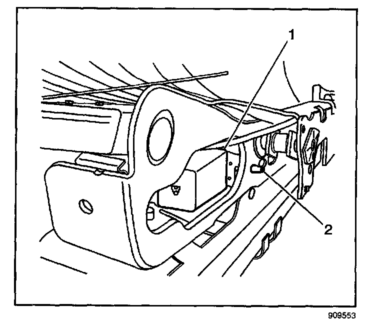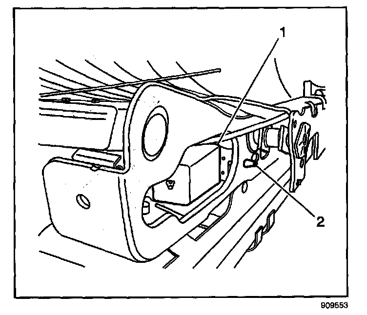 5. Pinch the retaining pin (2) together and pull the module (1) out from the seat inboard frame.
