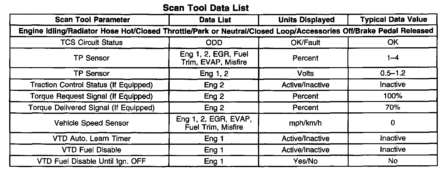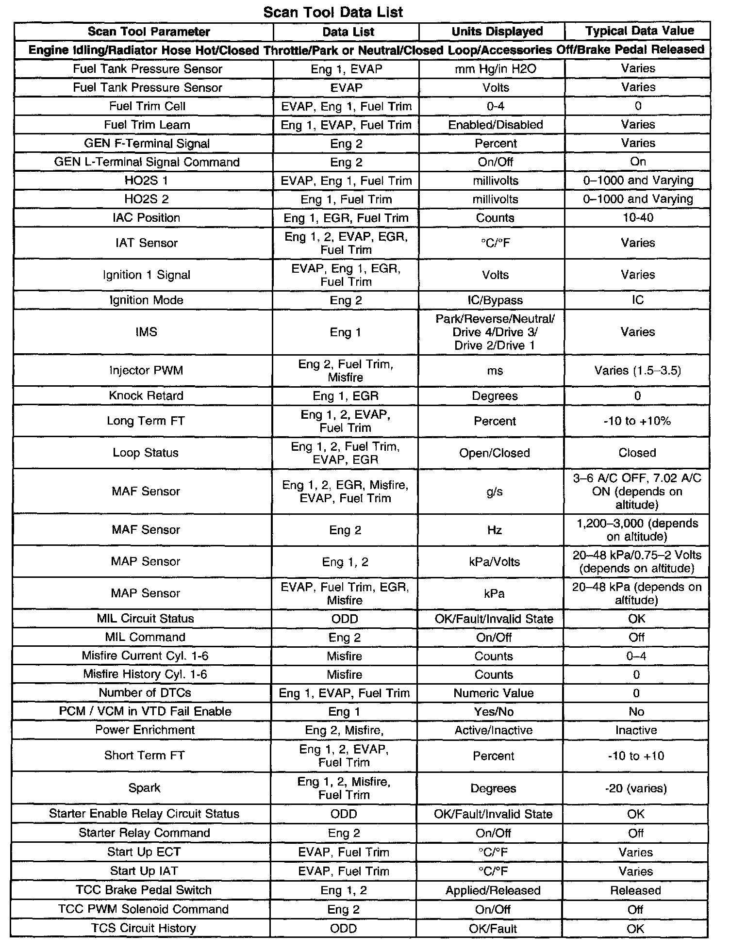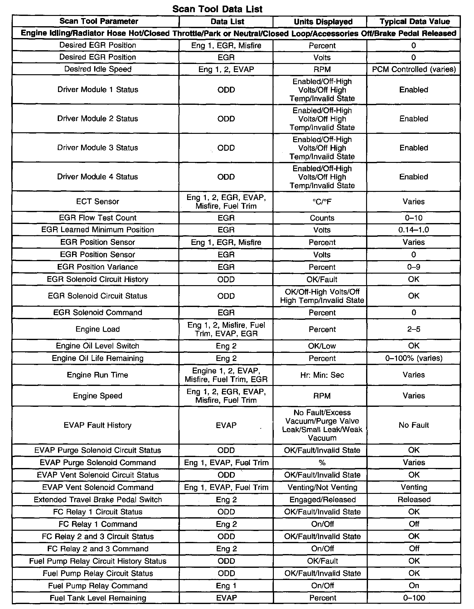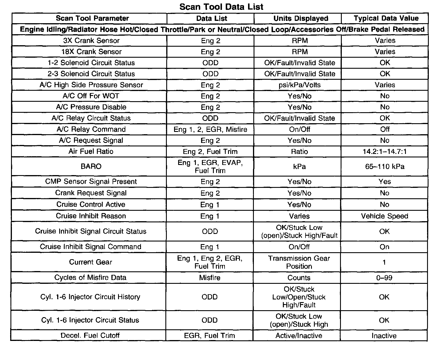 The Engine Scan Tool Data List contains all engine related parameters that are available on the scan tool. The list is arranged in alphabetical order. A given parameter may appear in any one of the data lists, and in some cases may appear more than once, or in more than one data list in order to group certain related parameters together.