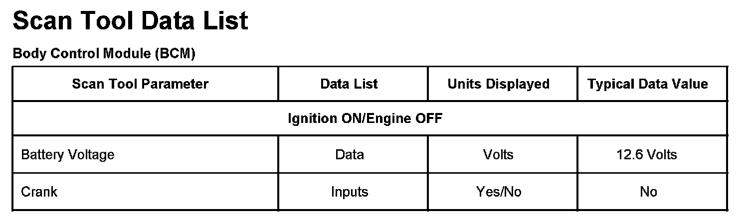 Scan Tool Data List - Body Control Module (BCM):