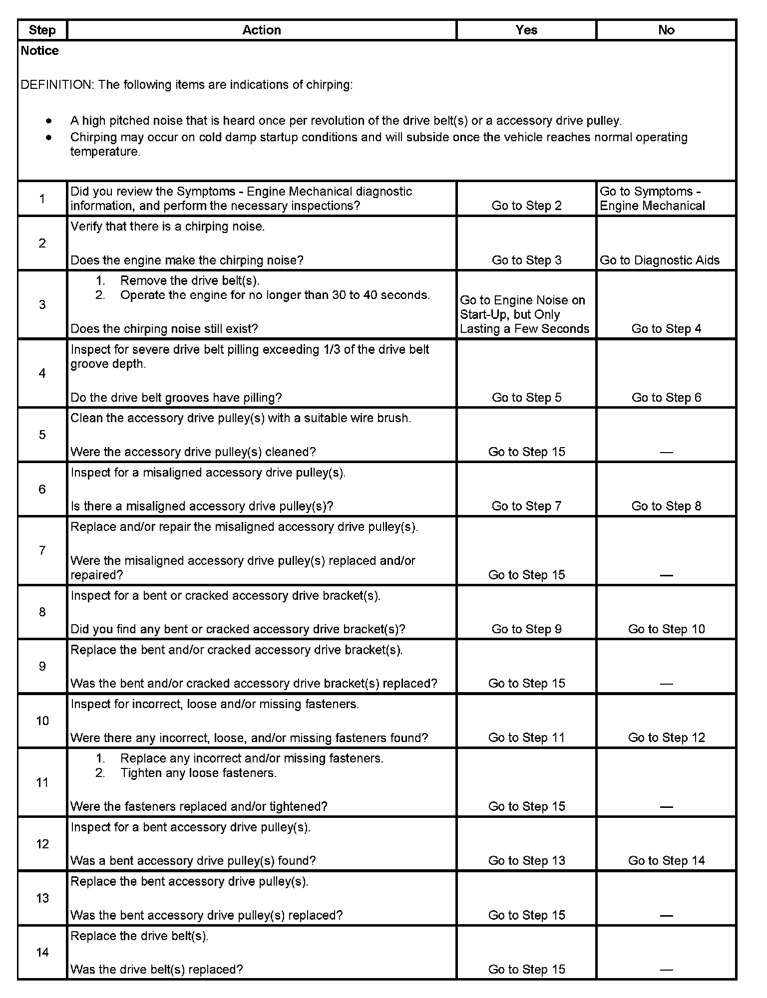 3. The noise may be an internal engine noise. Remove the drive belt(s) and operate the engine for a few seconds, this will verify if the chirping noise is related to the drive belt(s) or not. With the drive belt(s) removed the water pump will not operate and the engine may overheat. Also diagnostic trouble codes (DTCs) may set when the engine is operated with the drive belt(s) removed.