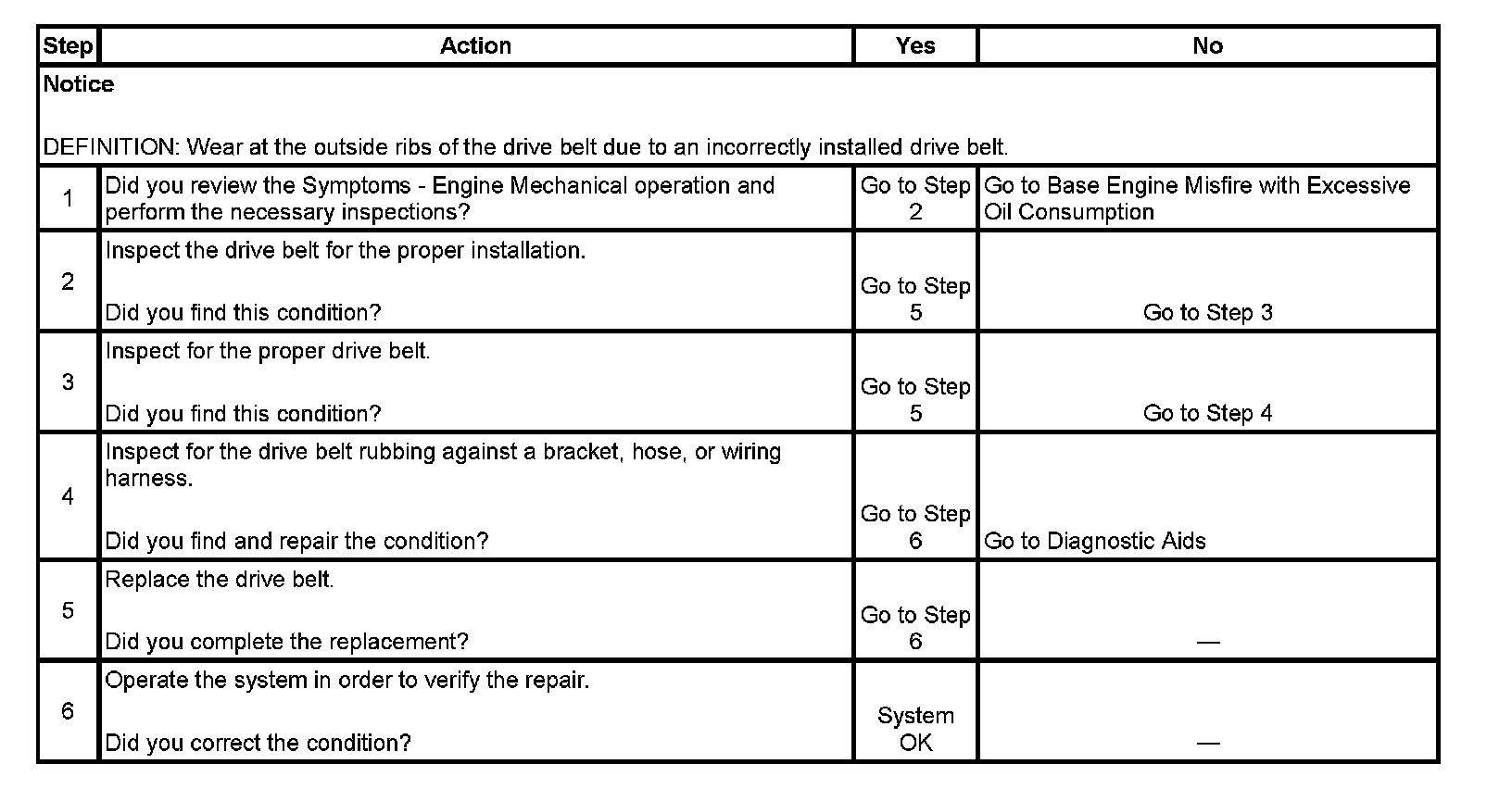 2. The inspection is to verify the drive belt(s) is correctly installed on all of the drive belt pulleys. Wear on the drive belt(s) may be caused by mis-positioning the drive belt(s) by one groove on a pulley.