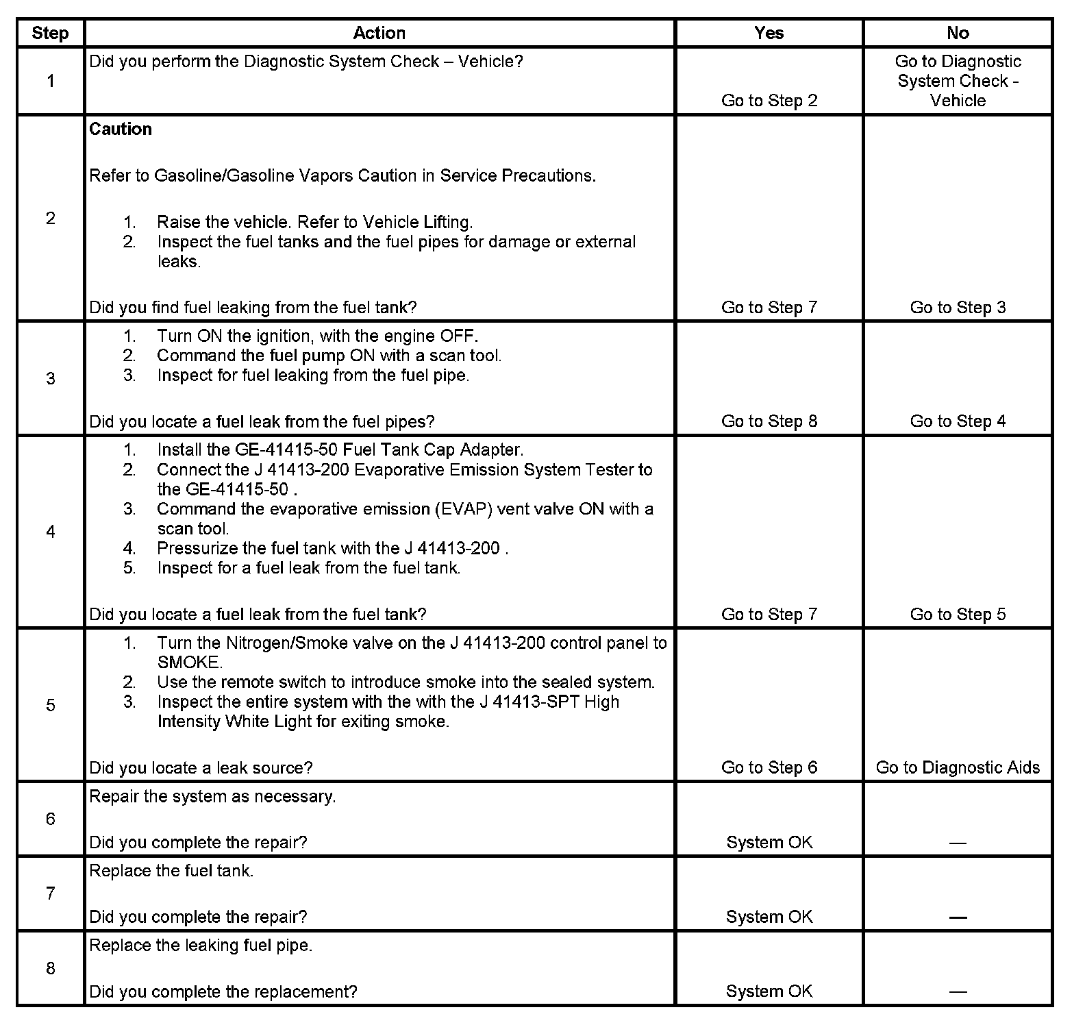 The fuel tank leak test is used to locate any fuel or fuel vapor escaping the fuel tank area. Fuel vapors escaping above the fuel level will be detected when the evaporative emission (EVAP) leak diagnostic completes one test cycle. The malfunction indicator lamp (MIL) will illuminate after the EVAP leak diagnostic completes two test cycles for a large leak or up to eight test cycles for a small leak, only when a condition is detected.