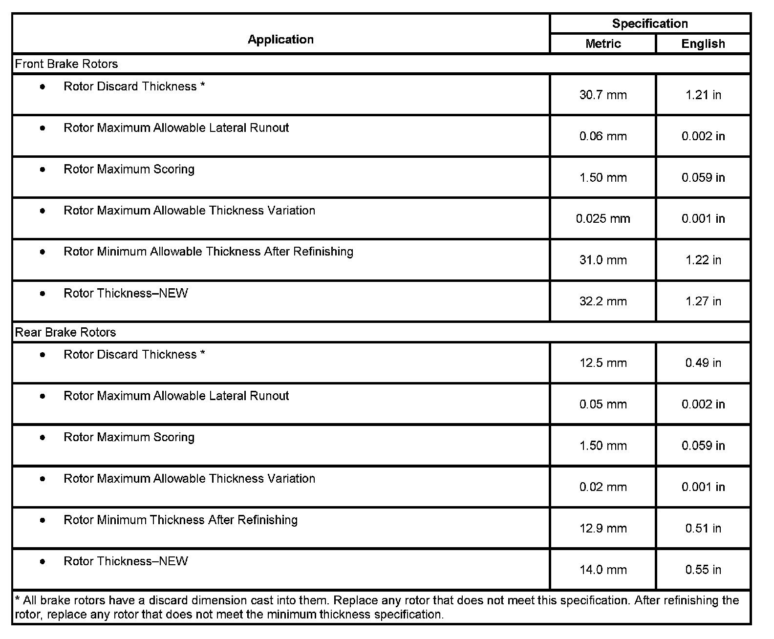 Disc Brake Component Specifications